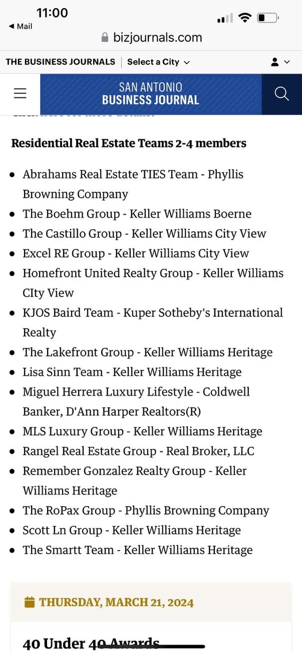 The San Antonio Business Journal (SABJ) published its annual list of Residential Real Estate Award finalists recently, and I'm proud to say that in just the second full year of existence the Abrahams Real Estate TIES Team has broken into the list of San Antonio's top small real estate teams for awards based on 2023 Sales. It is truly an honor to be alongside some of the most prominent names in San Antonio Real Estate - Icons who've graced the cover of Real Estate Publications like Real Producers, Luxury Home Magazine and others.